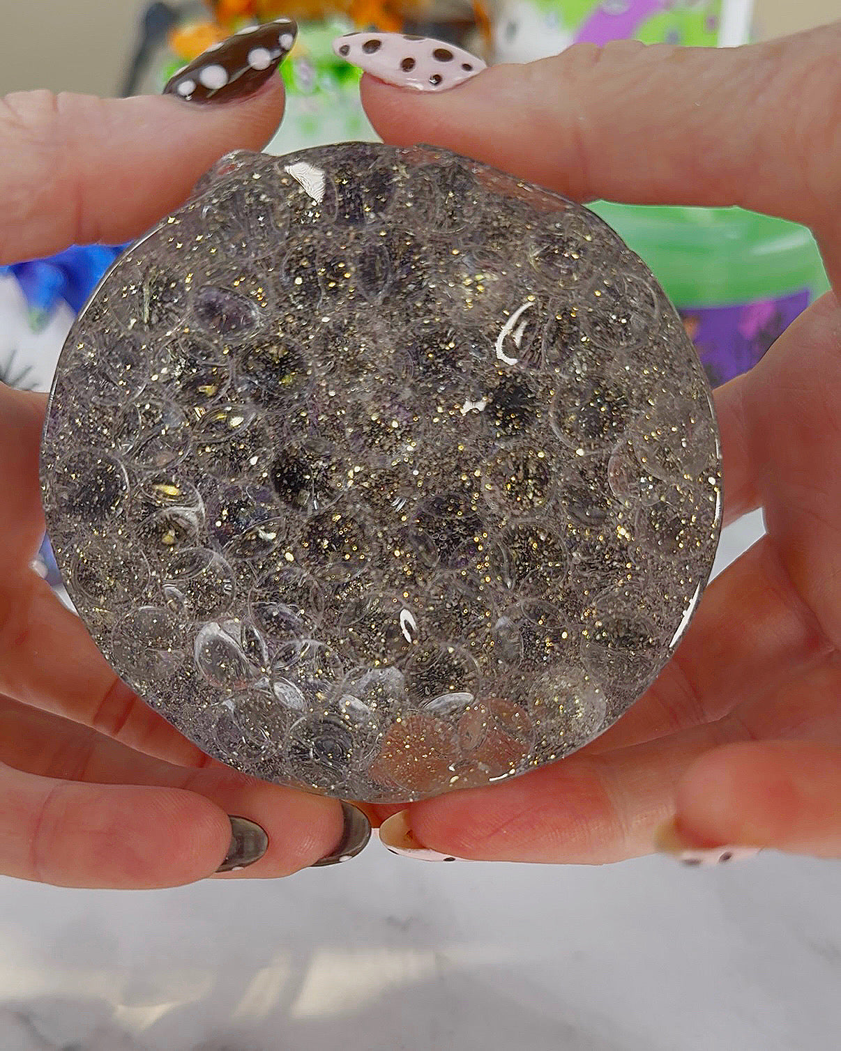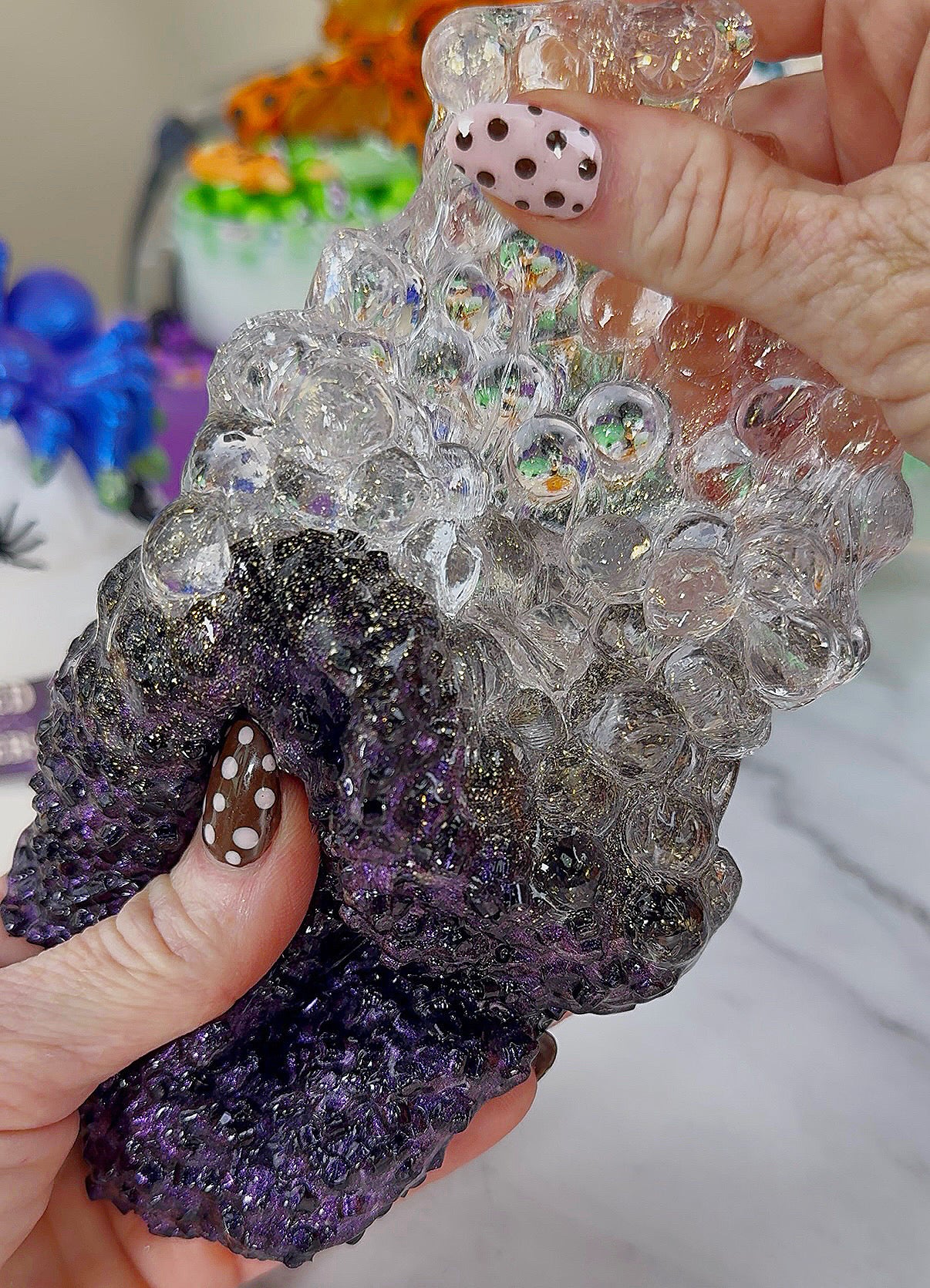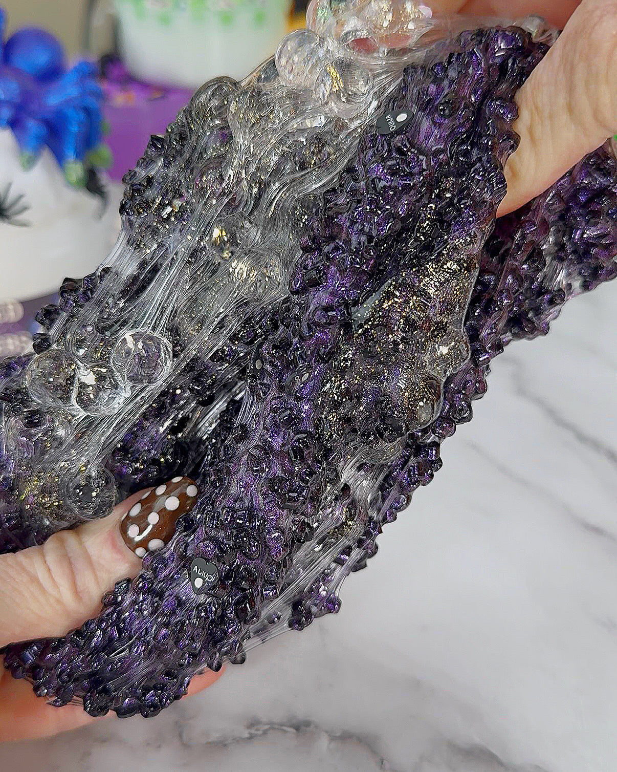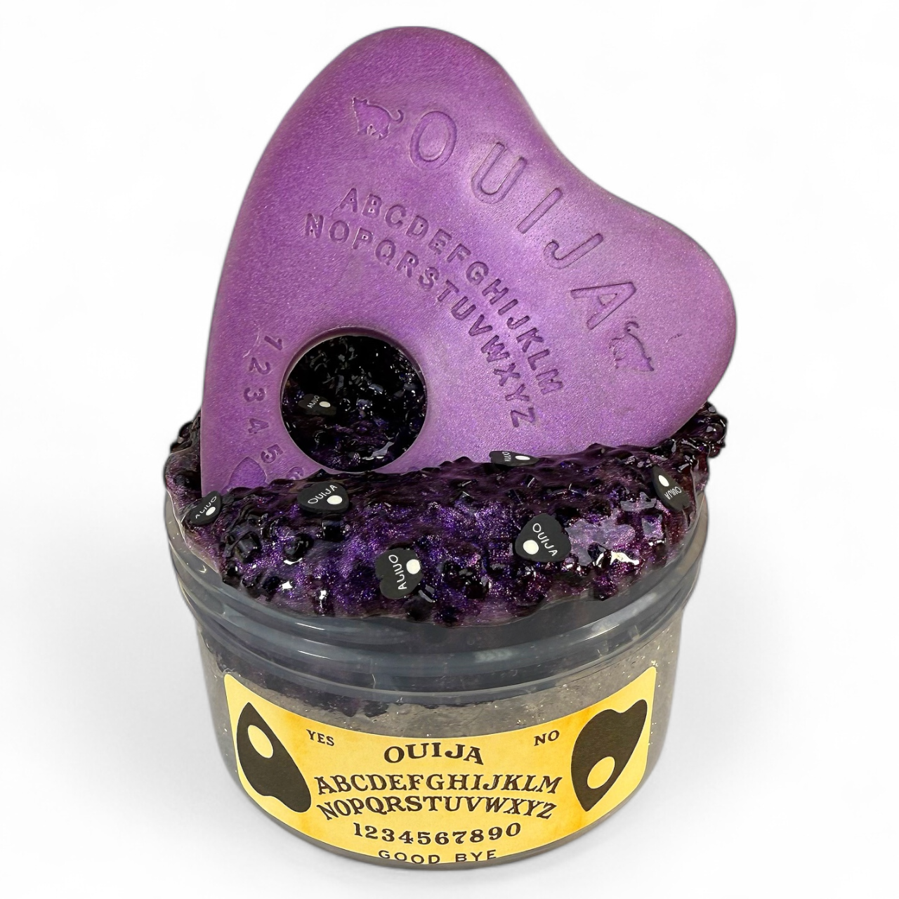 Introducing our new and improved Ouija Board slime! With a crackable wax planchette and a mix of bingsu bead and bubble bead slime flecked with gold, experience the ultimate ASMR while being mesmerized by this beautiful slime!
